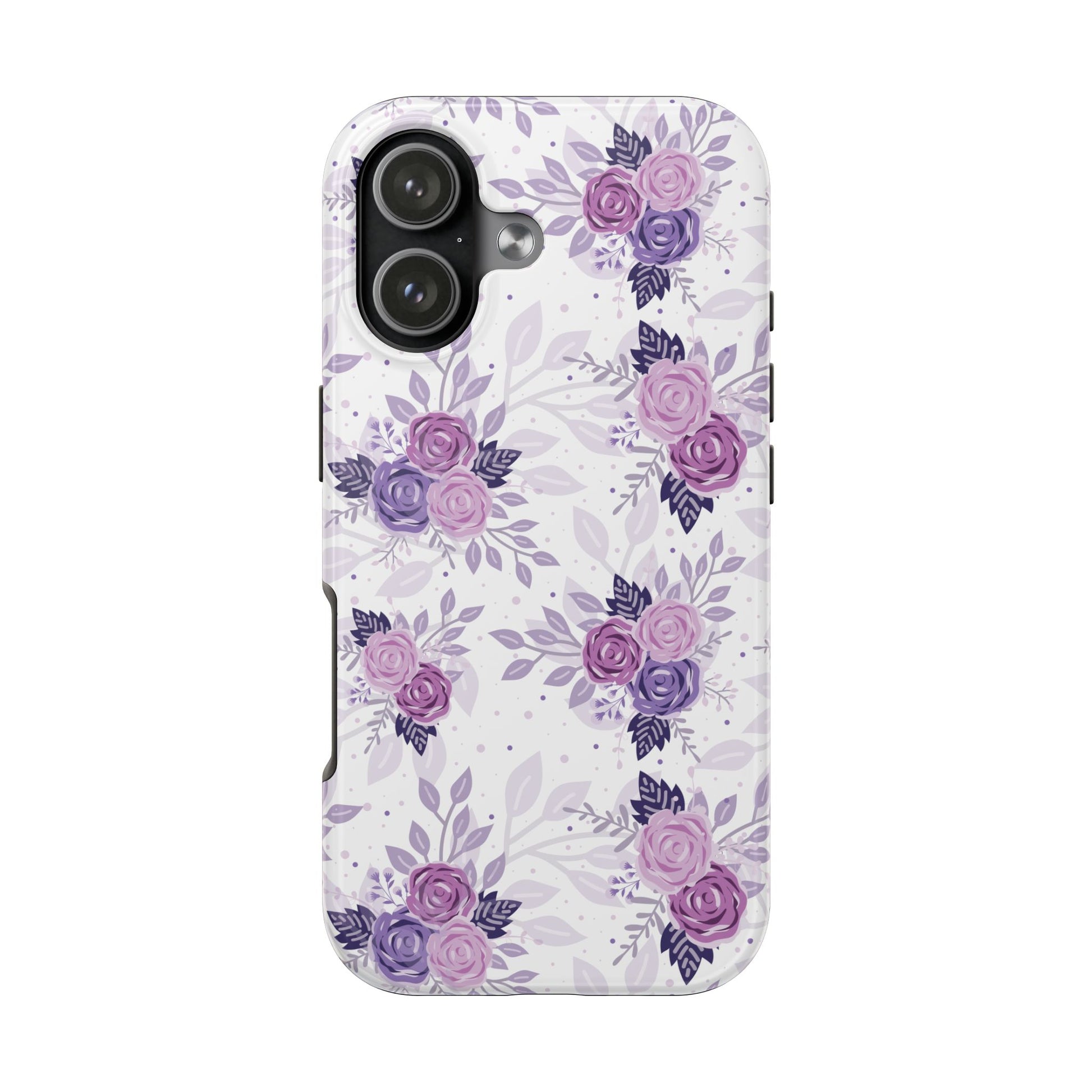 This tough phone case wraps your everyday carry in bold floral energy. Deep purple roses climb across a glossy surface, turning an ordinary pocket phone into a confident, feminine statement. The rigid polycarbonate shell and flexible TPU liner work together to soften drops and disperse shocks, while the lay-flat bezel keeps the screen off rough surfaces. It wears UV protection so the color stays vivid after sunny days, and the gloss amplifies the rich purples and fine petal details. Lightweight but protective, it slides into a bag without bulk and keeps wireless charging usable so you can stay powered without removing the case. It’s for people who want rugged, no-nonsense protection with a deliberate touch of floral style.